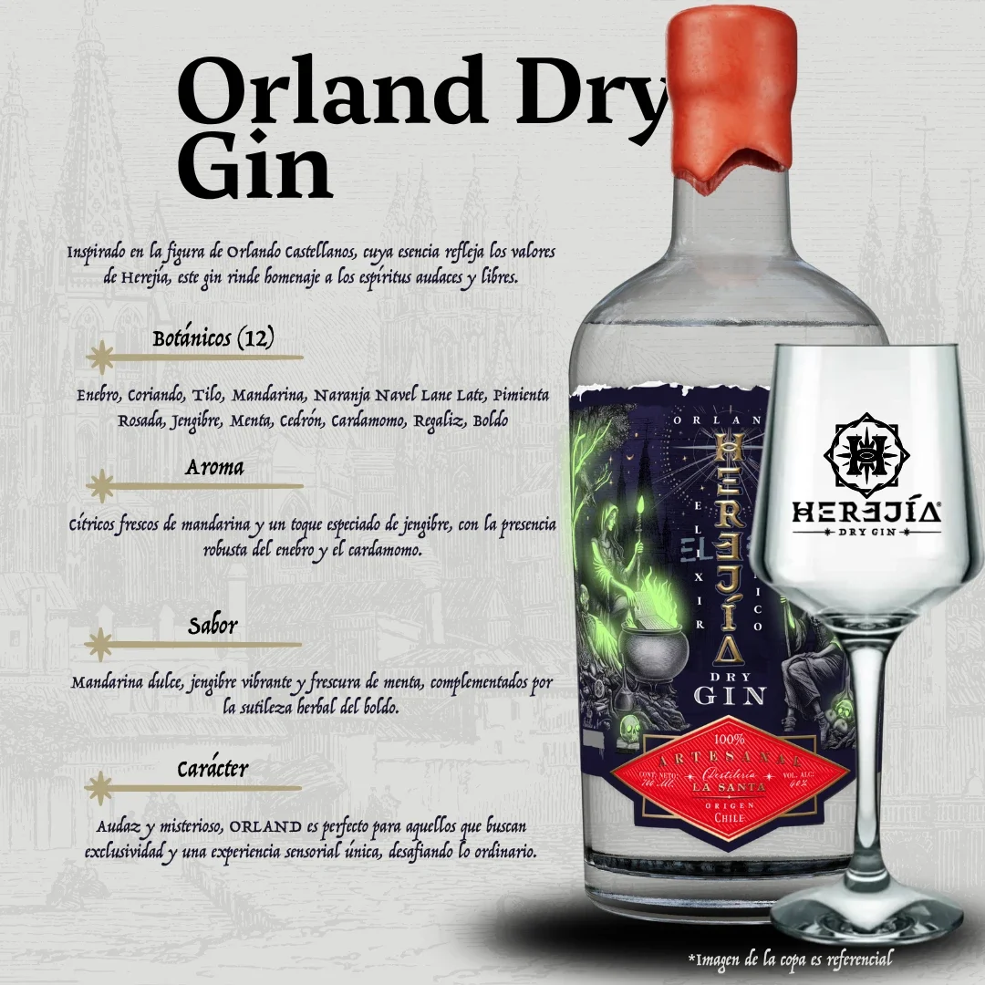 Orland Dry Gin Premium Box Incluye una botella de 700 ml de nuestro gin premium 100% artesanal y una copa exclusiva de 500 ml. Con sus notas cítricas y especiadas, es perfecto para regalar o disfrutar con estilo.