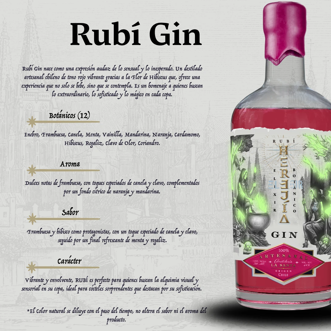 Sumérgete en la magia de Herejía Rubí Gin, un destilado artesanal que evoca el poder y la belleza del hibisco para crear un gin de un resplandor rojo vibrante.
